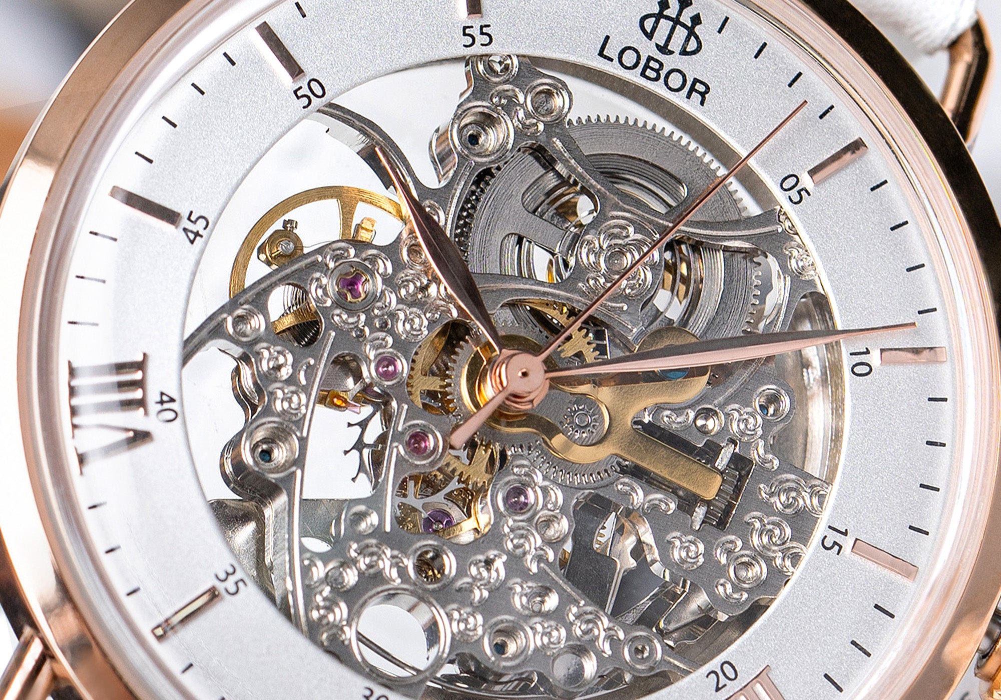 鏤空機芯細節精巧,寶石點綴其間,透過透明錶盤清晰呈現,兼具工藝精緻與華麗視覺效果。